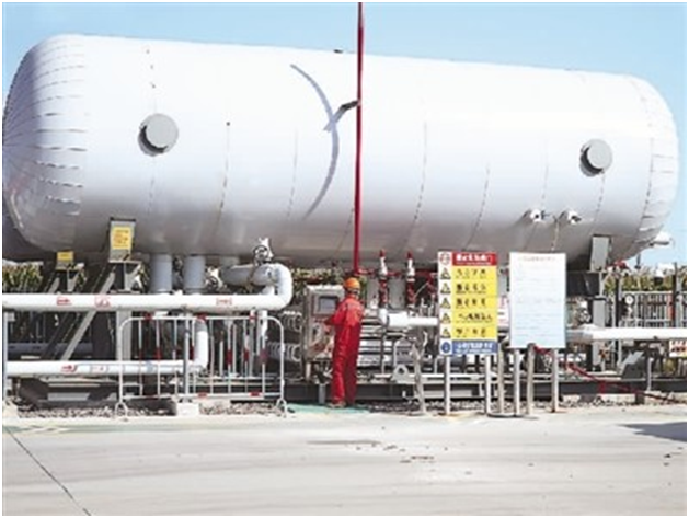 在齊魯石化—?jiǎng)倮吞锇偃f噸級(jí)碳捕集、利用與封存項(xiàng)目10號(hào)注氣站,一名工作人員在檢查設(shè)備。