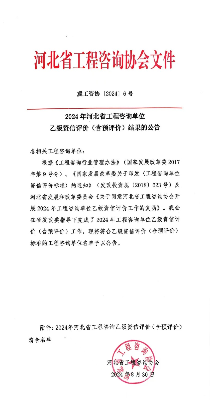 2024年8月30日,河北省工程咨詢協(xié)會發(fā)布《2024年河北省工程咨詢單位乙級資信評價(含預評價)結(jié)果的公告》,河北華飛工程設(shè)計有限公司(以下簡稱“華飛工程”)成功延續(xù)工程...