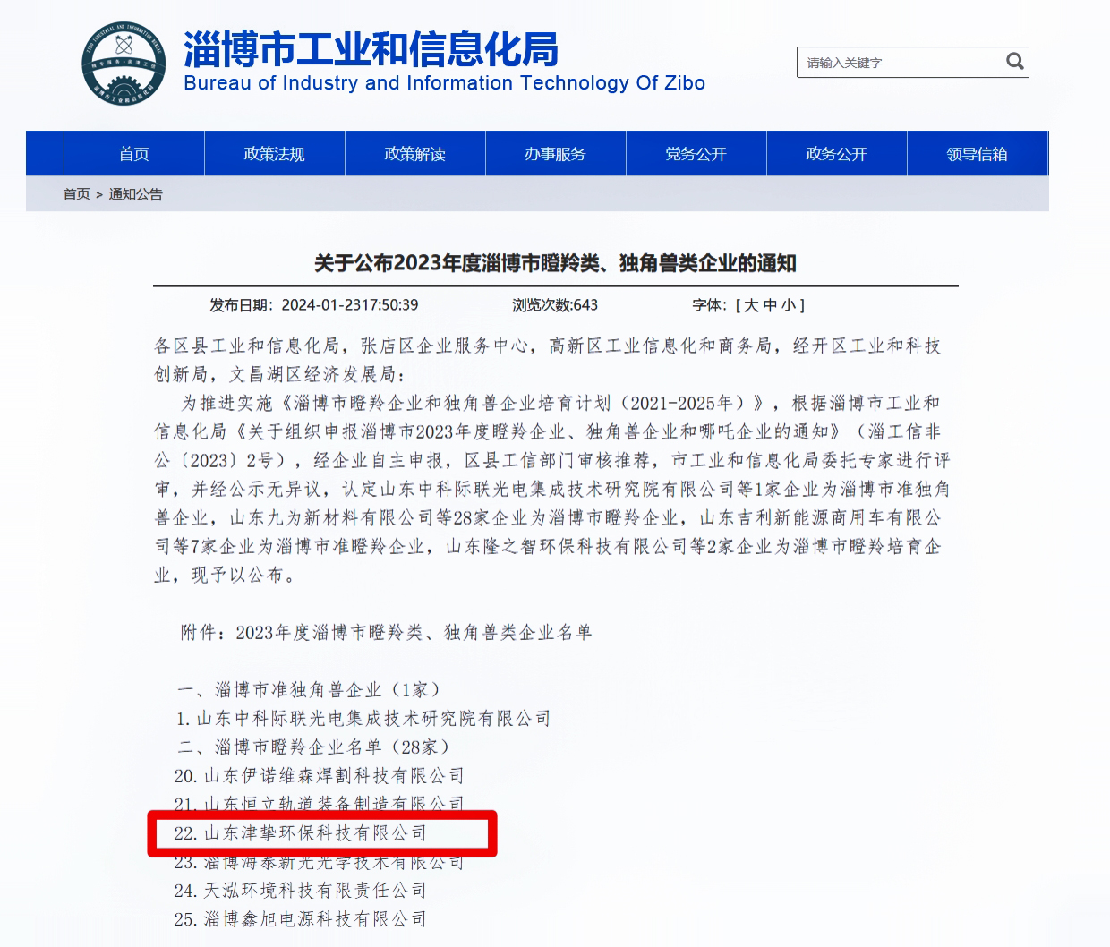 近日,淄博市工業和信息化局正式發布了2023年度淄博市瞪羚類企業名單,山東津摯環保科技有限公司(以下簡稱“津摯環保”)憑借其卓越的創新能力和穩健的發展態勢成功入選!