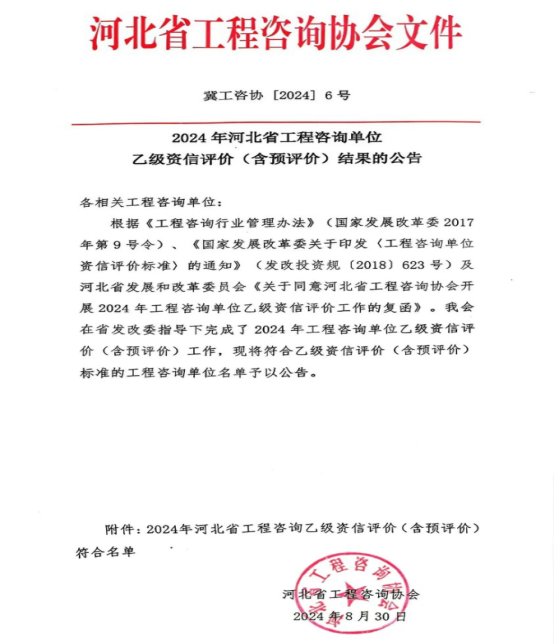 2024年8月30日,河北省工程咨詢協會發布《2024年河北省工程咨詢單位乙級資信評價(含預評價)結果的公告》,河北華飛工程設計有限公司(以下簡稱“華飛工程”)成功延續工程咨詢乙級資信。