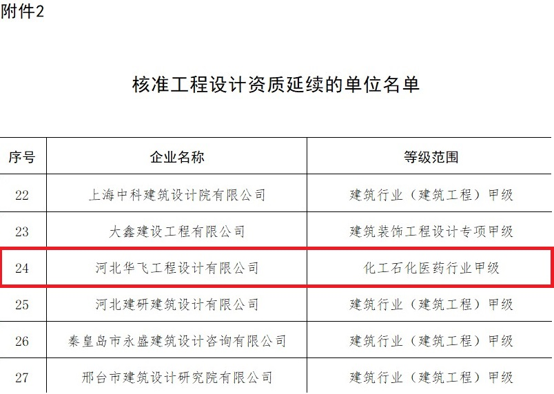 我司華飛工程成功延續“化工石化醫藥行業甲級”資質